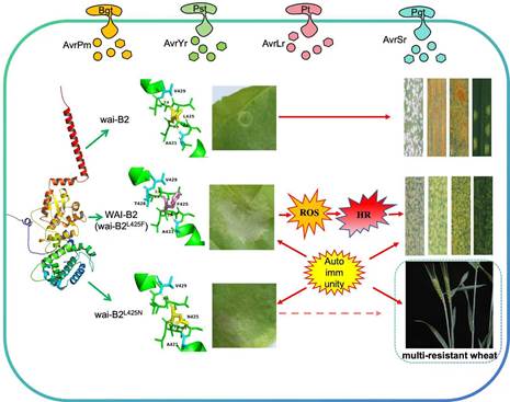 研究团队利用EMS(Ethyl-methanesulfonate)诱变筛选到小麦自发免疫突变体8P4087,发现其在自发激活免疫后会产生一系列活性氧(Reactive oxygen species,ROS)爆发、PR (Pathogenesis-related)基因表达量升高、PCD等过敏性坏死(Hypersensitive response)反应。研究团队从8P4087中克隆出控制自发免疫的基因WAI-B2(Wheat AutoImmunity-B2),WAI-B2编码一个未知功能的跨膜蛋白,通过遗传转化实验验证了其功能,并发现该基因对小麦白粉病、叶锈病、条锈病和秆锈病具有良好抗性,为广谱多抗基因。进一步分析表明,WAI-B2与TaHsp90和TaHsp70相互作用,这一相互作用在维持细胞稳定、信号转导和以及调控PCD非常重要。进一步明确了WAI-B2中的关键氨基酸位点与自发免疫表型的关系,通过AlphaFold 2和SWISS-MODEL预测最佳氨基酸替换位点及氢键作用位点,设计了一系列新型WAI-B2等位基因,并成功获得可在本氏烟中引发轻度细胞死亡的等位基因,为人工智能设计高产多抗作物品种提供了新的基因靶点。