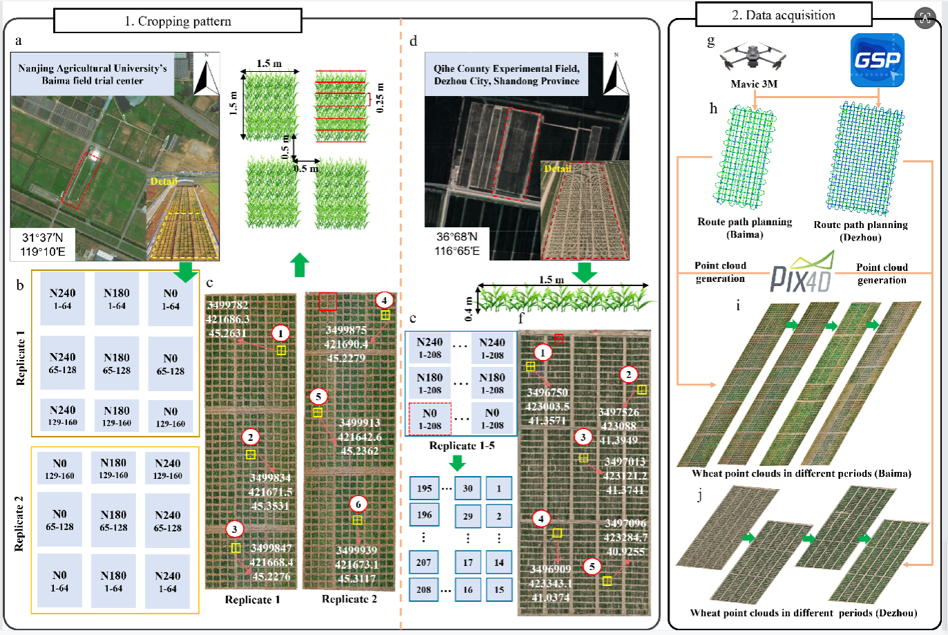 本研究选取长江中下游及黄淮海平原地区的160个自然小麦品种,在南京农业大学白马教学科研基地(31°36′57.8″N,119°10′46.1″E)开展田间试验。针对每个品种,设置三个氮肥梯度处理:零氮肥N0、中等氮素肥量N180以及较高氮素肥量,每个处理设置两个生物学重复,总计960个试验小区。对于每个1.5m × 1.5m的种植小区,团队采用行间距25cm,每行均匀种植约100株,行数为6行的种植方式种植每个小麦品种。同时,为了测试本研究构建的三维检测模型的泛化性,在山东省德州市齐河县(36°68′N, 116°65′E)对江中下游及黄淮海平原地区的208个自然小麦品种也进行了田间试验。同样设置三个氮肥梯度,每个氮肥梯度设置五个对照组,总计15个地块,每个地块的种植模式采用1.5m × 0.4m单行种植。