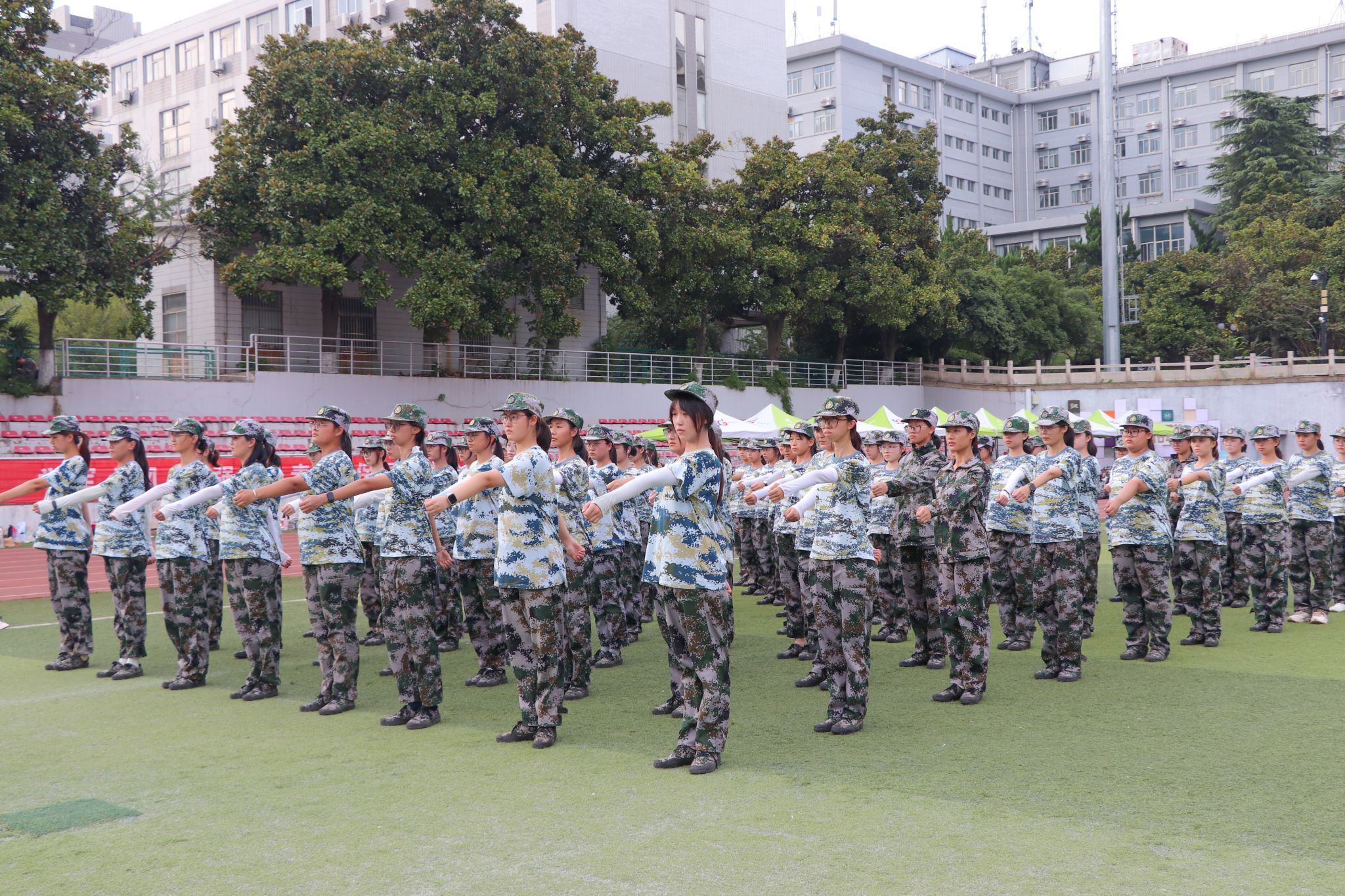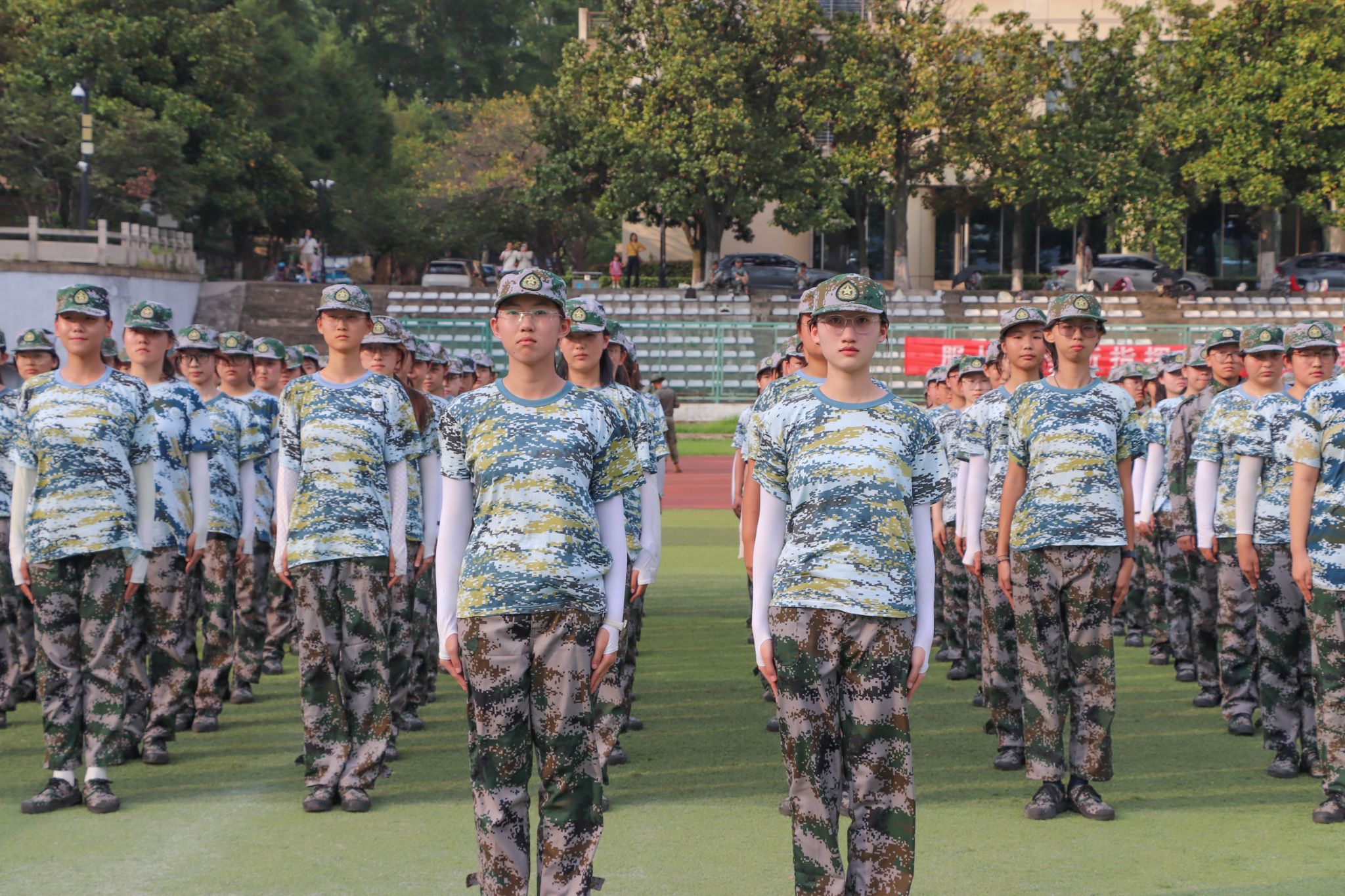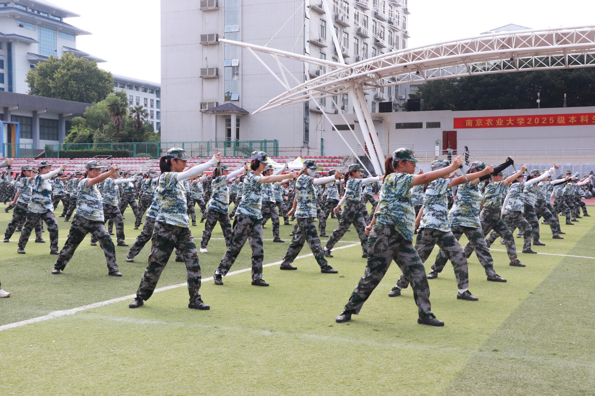 夏末余温未散,骄阳依旧高悬。农学院2025级全体新生,身着整齐迷彩,以饱满的热情,肃立在操场,在烈日下展示独属于他们的军训风采。