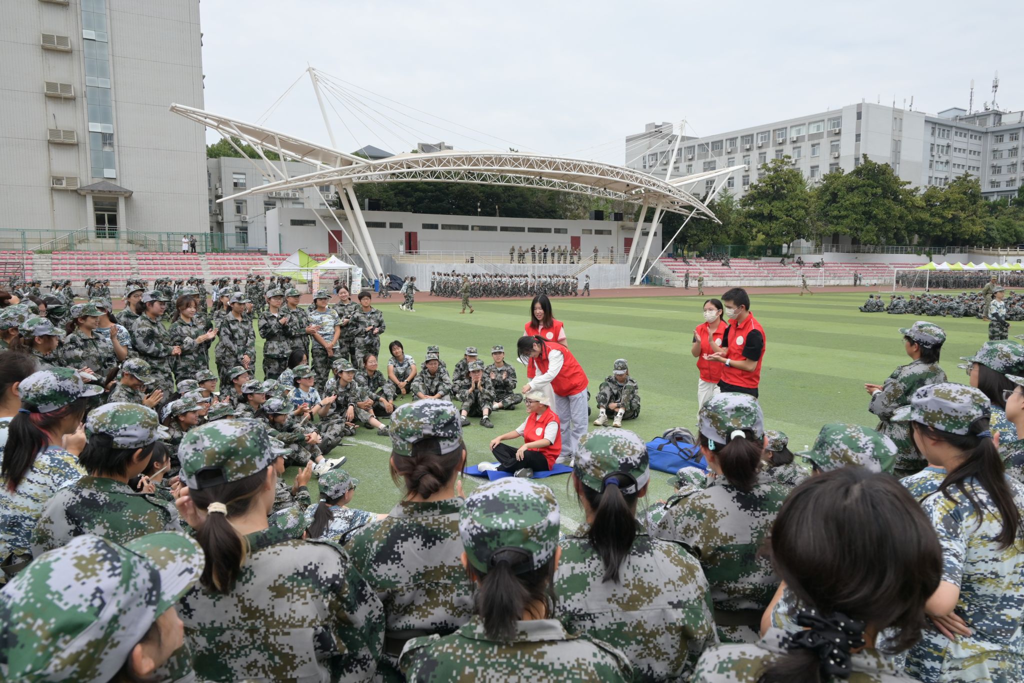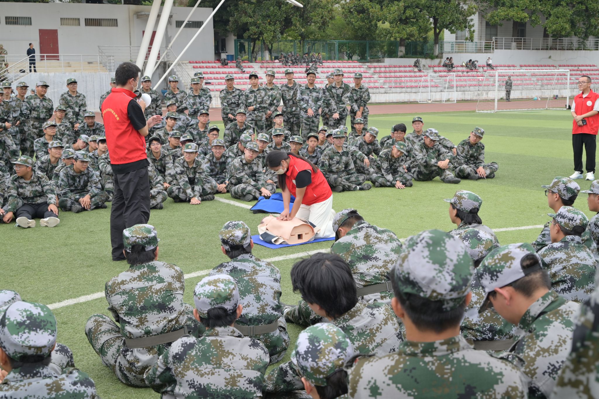 军训不仅有体能的锤炼,更有实用技能的赋能。学院红十字分会成员在现场向新生演示了心肺复苏与头部伤口包扎技巧,同学们全神贯注学习急救知识。这场培训让新生们明白,军人的担当不仅是挺身而出的勇气,更要有守护生命的能力。