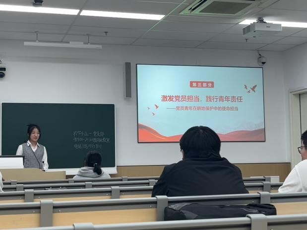 第三部分由农学242班的郎一诺同学主讲。该部分主讲人聚焦党员青年的责任担当,分享了南京农业大学专家参与国家耕地保护立法、全国土壤普查与耕保培训的实例,以及陕西延安“田长守护网络”机制、安徽全椒县“党支部+网格党小组+党员中心户”三级管控体系等基层创新实践,凸显党员在耕地数量守护与质量提升中的先锋作用。