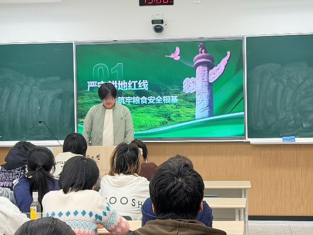 第一部分讲解中,尚宇轩同学以“严守耕地红线——筑牢粮食安全根基”为核心,系统解读《永久基本农田保护红线管理办法》。从政策出台背景切入,阐明粮食安全是“国之大者”,耕地作为粮食生产命根子的战略地位,详细介绍该办法的审议过程与施行时间;通过阐释永久基本农田保护红线的定义、划定标准,明确其与生态保护红线、城镇开发边界并列的国土空间规划三大控制线属性;深入分析政策出台的现实需求,解读“坚持问题导向、系统观念、底线思维、实事求是”的起草思路,重点强调禁止占用永久基本农田挖湖造景、建设绿化带等违规行为;最后以填空题形式梳理政策关键要点,帮助参会人员巩固学习成果,深化对耕地“数量、质量、生态”三位一体保护要求的理解。