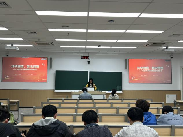 刘妍妍同学主讲“共学回信,强农报国——习近平总书记重要回信精神学习”主题学习会。她围绕习近平总书记重要回信的核心要义、时代意义与青年践行路径展开,深入解读回信中对农科学子“强农报国”的殷切期望。学习会从回信精神的历史背景切入,阐释其在乡村振兴、农业现代化进程中的指导价值,结合农业领域先进典型案例,展现回信精神如何激励农科学子投身农业科研、基层实践。刘妍妍强调,回信精神是农科学子成长成才的行动指南,号召同学们将个人理想融入强农报国的时代使命,在种业创新、农田保护、智慧农业等领域深耕实践,以青春之力助力农业强国建设。此次学习会凝聚了大家对回信精神的共识,激发了农科学子扎根农业、奉献乡村的坚定信念。