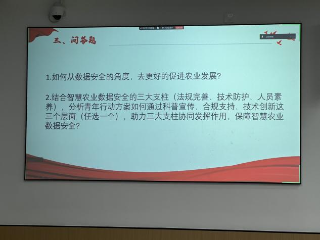 本次理论学习的主题是“智慧农业数据安全——赋能农业高质量发展与全球价值链提升”为主题的理论学习。主讲人赵珉熠从“战略定位”“五大数据风险”“三大守护支持”“青年行动方案”四大维度展开,聚焦智慧农业数据安全领域,剖析其在赋能农业高质量发展与提升全球价值链中的关键作用,明确数据安全对智慧农业发展的战略意义,梳理行业面临的五大数据风险,提出三大守护支持举措,制定青年行动方案。此次学习对智慧农业数据安全领域的关键要点有了系统认知,更为推动农业数字化进程、助力农业高质量发展和全球价值链升级凝聚了共识,激发了农科学子在智慧农业数据安全领域深耕细作、贡献力量的决心。
