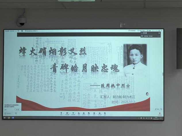 种子251班阿力帕·阿力木江同学以《烽火硝烟彰义烈 青碑皓月映忠魂——致周执中烈士》为题,深情讲述周执中烈士的英勇事迹。她通过历史文献与烈士影像,展现周执中在烽火岁月中坚守正义、舍生取义的革命精神,回溯其为民族解放事业奉献生命的光辉历程,彰显烈士的忠魂与大义。
